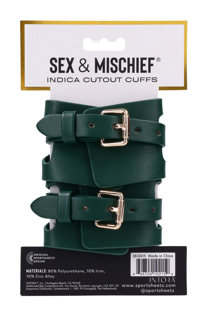 Surrender in style. The Indica Cutout Collar wraps the neck in rich emerald green with luxe gold hardware and sensual cutout accents that expose just enough skin. Lined for comfort, this collar is a soft but striking symbol of submission—an invitation to give in and give over. The coordinating gold chain leash with green handle lets your dominant guide the pace, whether you’re at home or on display. Pair with the Indica Cutout Cuffs for a beautifully bound look.